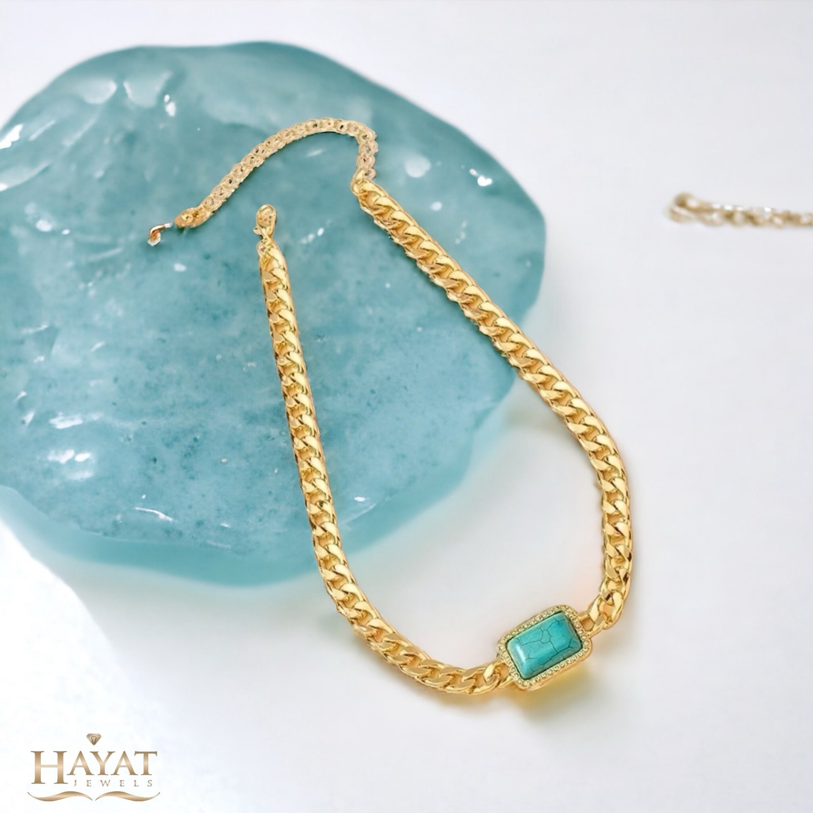 Γυναικείο κολιέ από χρυσή αλυσίδα με ειδική επιχρύσωση και επέκταση καθώς και ιδιαίτερο στοιχείο τιρκουάζ πέτρα στο κέντρο που περιβάλλεται απο μικρα λευκά ζιργκον.Διαθέτει μεγάλη ανθεκτικότητα σε γρατζουνιές,νερό και αρώματα.