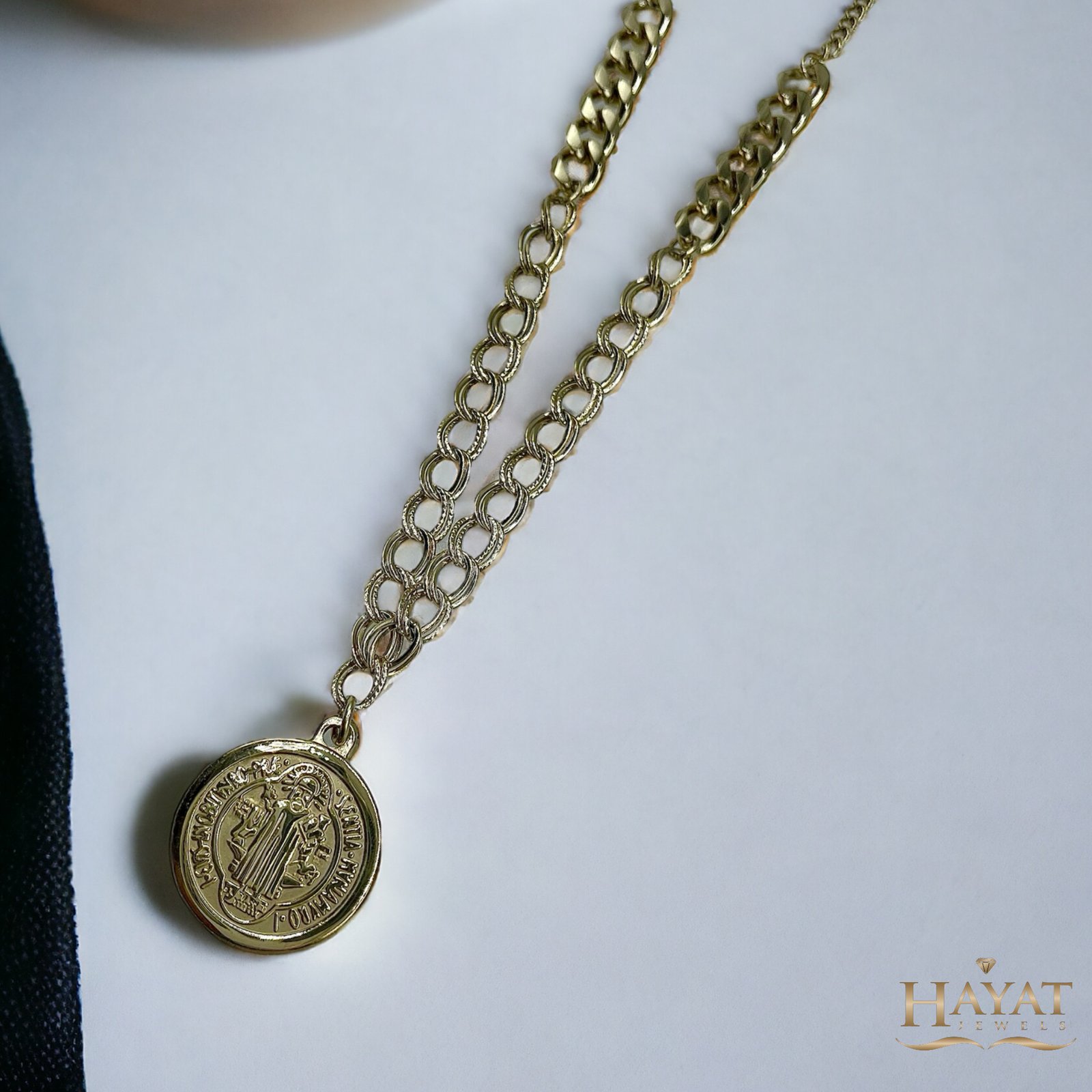 Διαθέτει ένα κρεμαστό κωνσταντινάτο σε στρόγγυλο σχήμα μεγέθους 2,5 cm από επιχρυσωμένο ανοξείδωτο ατσάλι και μπορεί να φορεθεί και απο τις δύο όψεις. Το ιδιαίτερο χαρακτηριστικό του είναι η αλυσίδα που είναι κατασκευασμένη απο τρείς διαφορετικούς τύπους και τα κάνει μοναδικό.