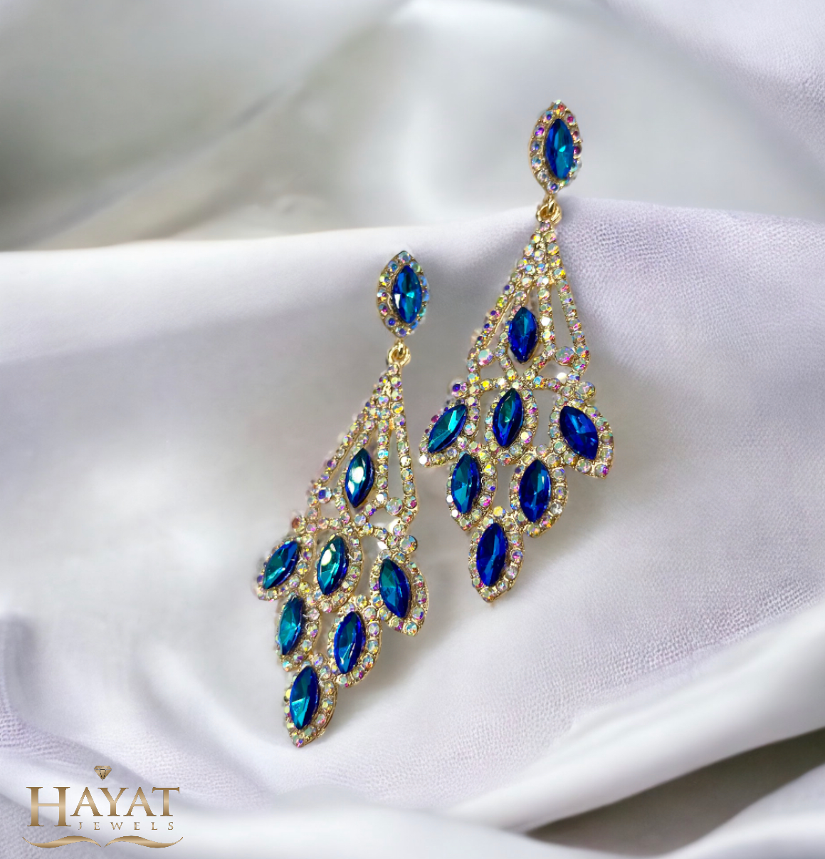 Εντυπωσιακά κρεμαστά σκουλαρίκια σε αποχρώσεις μπλέ χρώματος με συνολικό μήκος 8,5cm κατασκευασμένα απο υψηλής ποιότητας ανοξείδωτο ατσάλι ανθεκτικά στο νερό και στις γρατζουνιές.